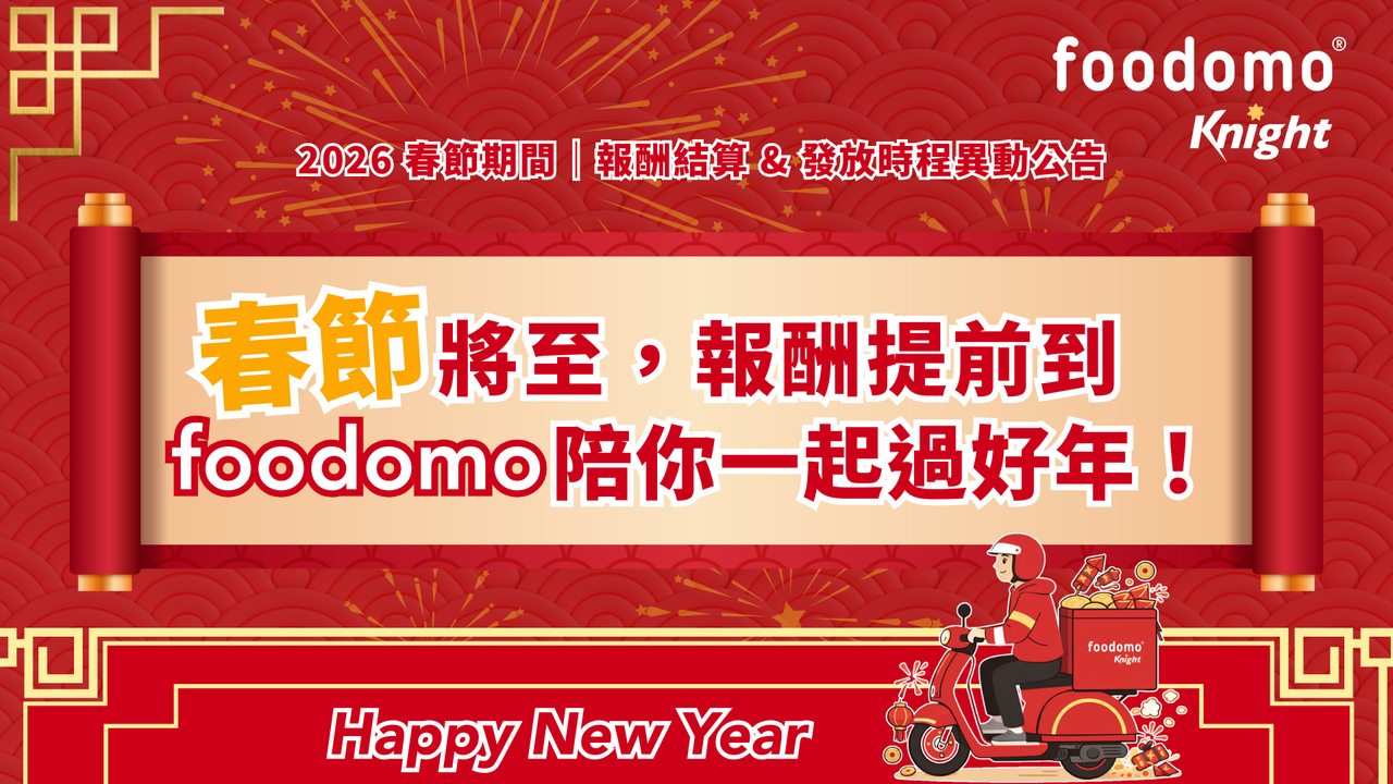 foodomo 感謝每位騎士的付出與支持!提前發放報酬,讓大家安心過節、荷包暖暖迎新年!